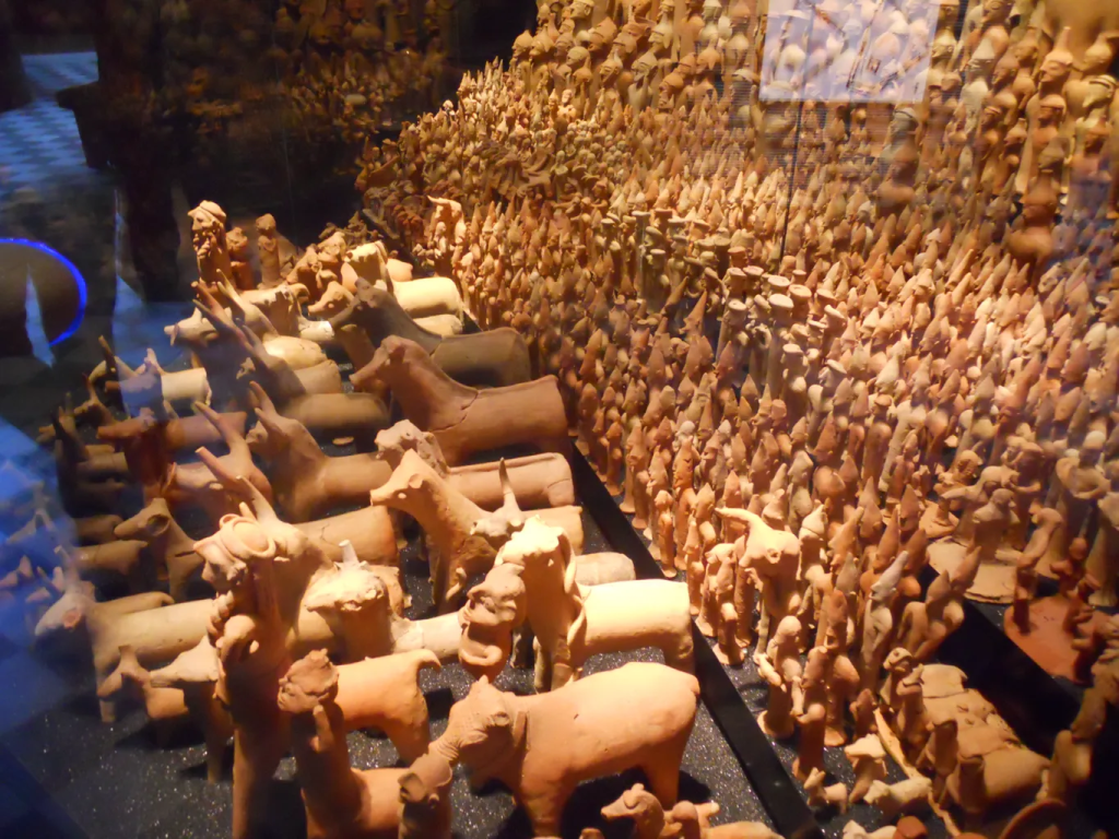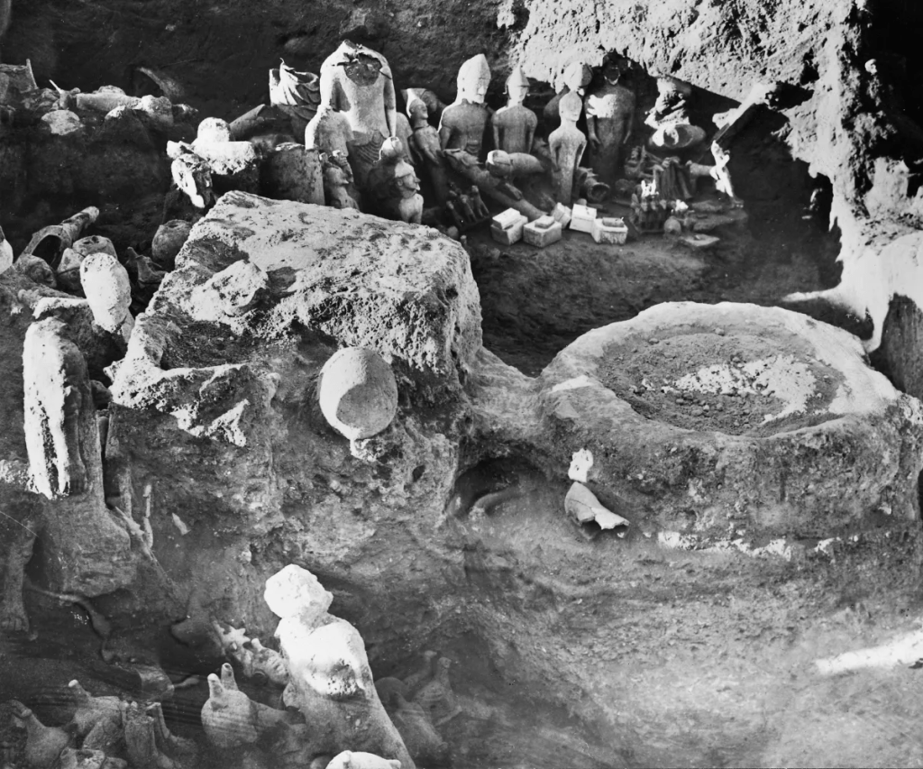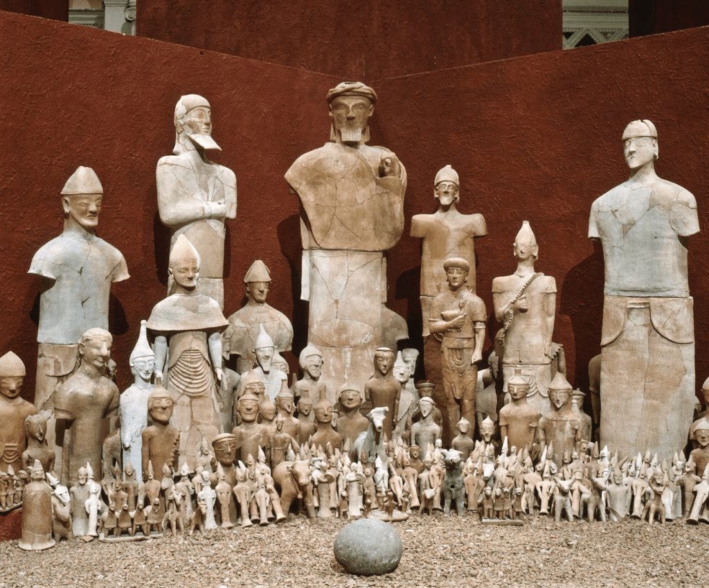 A tan solo medio metro bajo tierra, los arqueólogos descubrieron una disposición semicircular de estatuas de terracota que representaban sacerdotes, guerreros, músicos y animales.