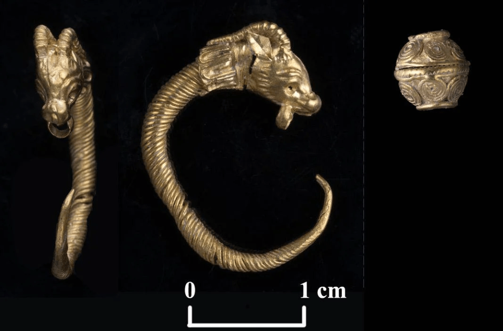 Además del anillo de oro, los arqueólogos descubrieron varios aretes de bronce, una cuenta de oro y un arete de oro de intrincado diseño con un motivo de animal con cuernos. Todos se encontraron en la misma capa estratigráfica, lo que sugiere una deposición deliberada y culturalmente significativa. Los investigadores actualmente exploran la teoría de que estos objetos fueron enterrados como parte de un ritual simbólico de transición para mujeres jóvenes.