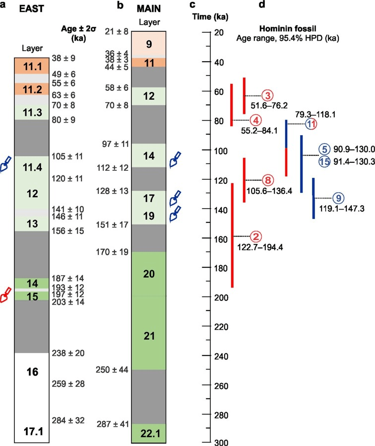 El ADN de Homo sapiens se identificó en las capas más recientes, datadas entre hace 25.000 y 20.000 años, aunque no se han encontrado restos óseos, sí dejaron señales genéticas y objetos distintivos como un colgante de diente de ciervo y una figura de marfil de mamut.