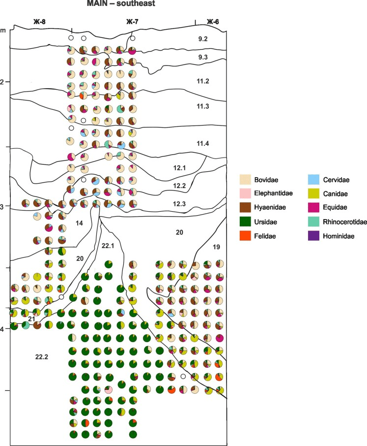 Los antiguos humanos compartieron la cueva con una gran variedad de animales, como osos, hienas, bisontes, rinocerontes lanudos, mamuts, lobos, zorros y ciervos. El análisis de su ADN permitió rastrear los cambios en la fauna en función del clima, observándose, por ejemplo, variaciones en los tipos genéticos de hienas y un aumento de bisontes y ciervos en épocas más frías.
