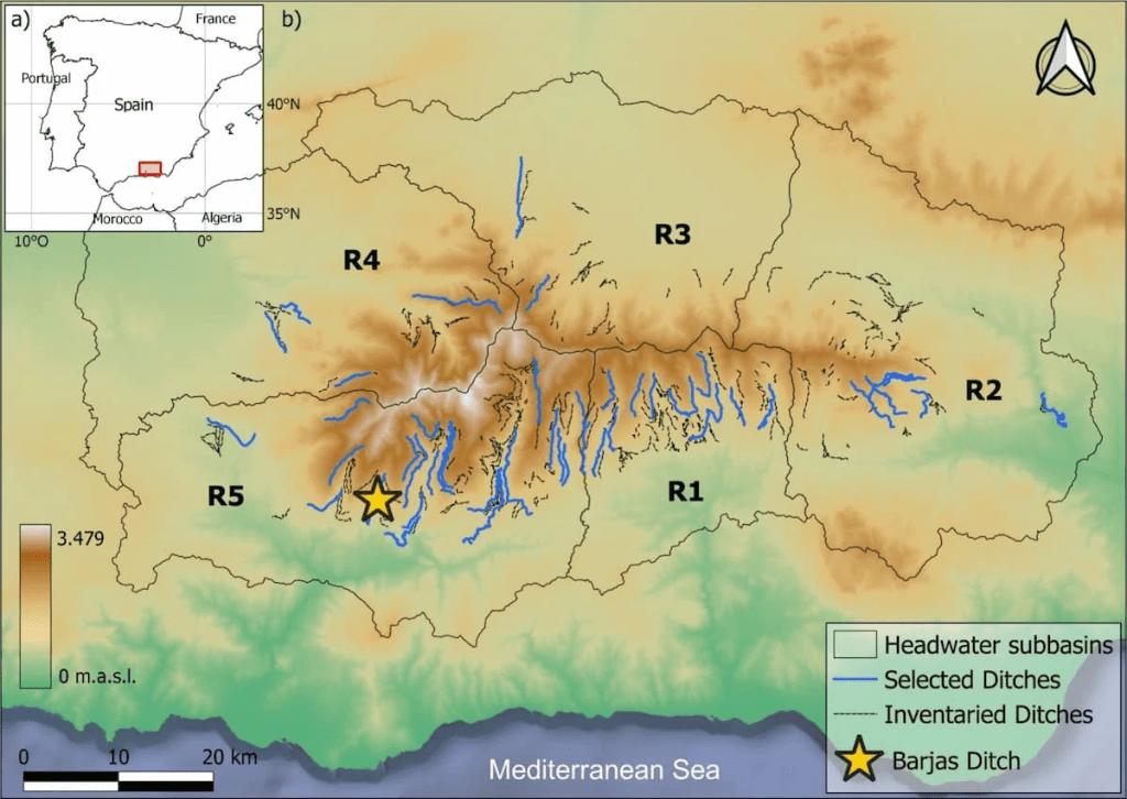 Además del análisis general, que incluyó 45 de las acequias más largas de Sierra Nevada, el equipo centró parte de su trabajo en un caso concreto, la acequia Barjas, restaurada en 2014 por el proyecto MEMOLA de la Universidad de Granada.