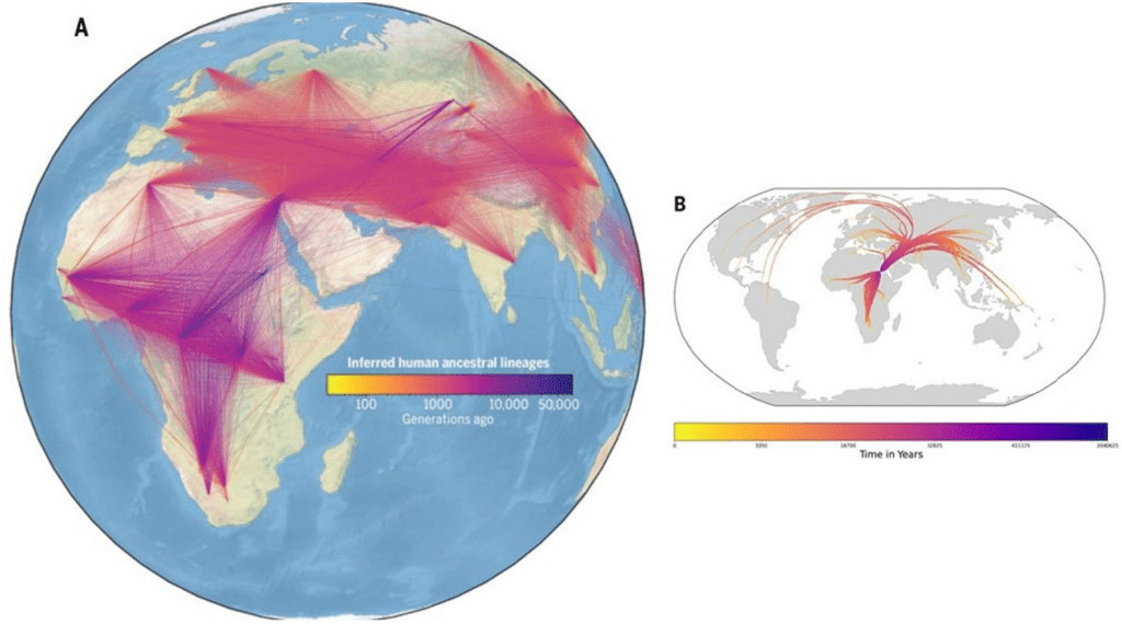 (A) Inferred human ancestral lineages over time and space. Each line represents an ancestor-descent relationship in inferred geneology of modern and ancient genomes. Line width corresponds to how many times the relationship is observed, and color intensities are based on the estimated age of the ancestor. (B) Visualization of the nonparametric estimator of ancestor geographic location, meaning the average location of the ancestors of each population from t = 0 to −2,000,000 ya. Widths of lines are proportional to the number of ancestors of each population over time. The ancestor is defined as an inferred haplotype with at least one individual in that population. Source: Wohns et al. (2022). Hide