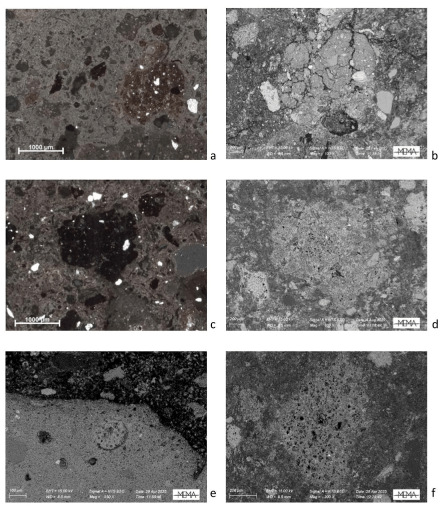 Thin-section microphotographs of ceramic aggregates used in Iron Age plaster at Tell el-Burak: (a, b, e) Type 1 ceramics—low-fired sherds with high porosity—shown under polarising light (XP) and in BSE imaging at high magnification; (c, d, f) Type 2 ceramics—high-fired, vitrified fragments—featuring isotropic matrix and bloating pores, also shown under XP and BSE. Credit: S. Amicone et al., Scientific Reports (2025)