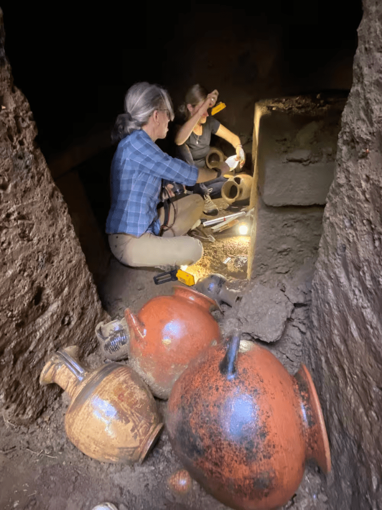Investigadoras extrayendo los objetos descubiertos en el interior de la tumba. Crédito: Jerolyn Morrison