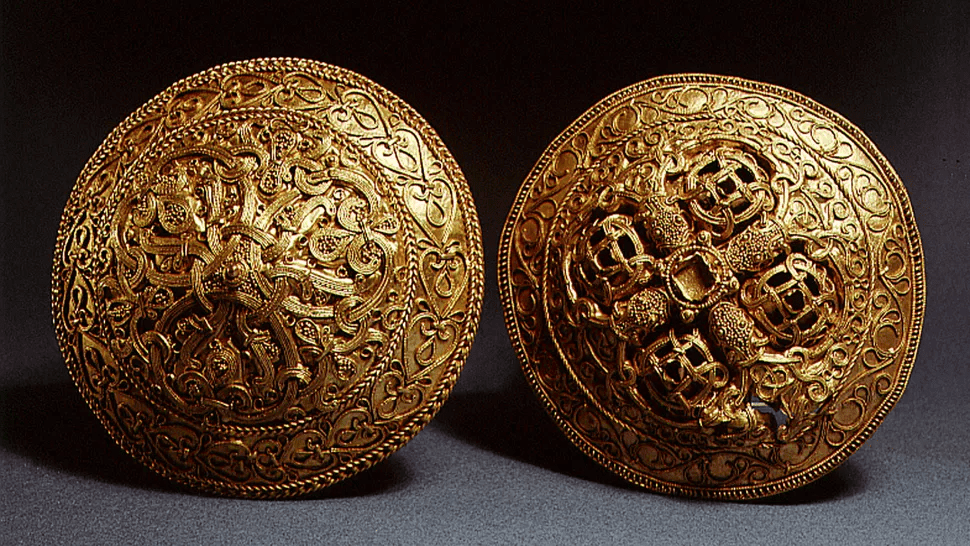These two intricately crafted gold brooches, dating back to the early 11th century, were found alongside a gold arm ring. Credit: National Museum of Denmark