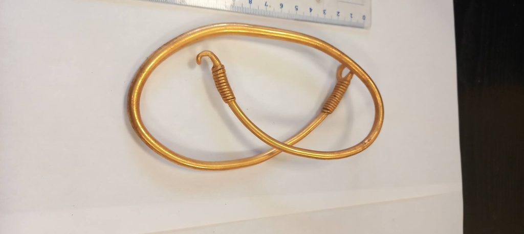 Un hallazgo arqueológico ha surgido de los bosques cercanos a Kalisz, Polonia: un enorme collar de oro doblado con un peso de 222 gramos. Inicialmente confundido con un fragmento de un brazalete de oro, el artefacto fue desenterrado el 7 de agosto de 2025 por Mateusz Lachowicz, miembro del grupo de exploración histórica SPŚH DENAR Kalisz.