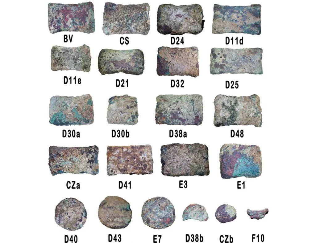 A finales de 2024, el equipo ya había recuperado 52 lingotes de cobre en forma de almohada, 19 lingotes discoidales y 8 fragmentos menores. Según la clasificación de Bucholz-Bass, los lingotes almohada corresponden a los tipos 1a y 1b, lo que sugiere que se produjeron en el mismo periodo en talleres vecinos.