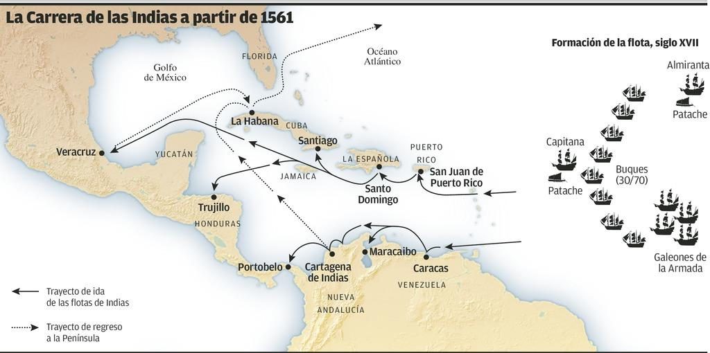 Para proteger el flujo de riquezas del acoso de corsarios y enemigos, se estableció el sistema de navegación obligatoria en convoy, con escolta militar y rutas fijas. El sistema de flotas, regulado definitivamente en 1564, contemplaba dos convoyes anuales: la flota a Nueva España (con destino a Veracruz) y los galeones a Tierra Firme (con destino a Portobelo), que se reunían en La Habana para el viaje de regreso a España.