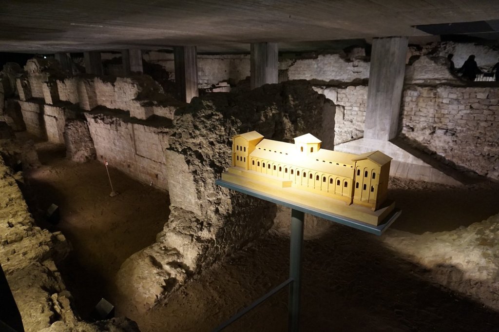 El punto de partida lo constituye la reexcavación del ábside de un gran edificio basilical de cuatro naves levantado en el siglo IV. Lo que en superficie apenas se manifestaba como una leve depresión en el pavimento del Rathausplatz se ha revelado ahora, tras la apertura de un perfil estratigráfico, como un macizo de cimentación de hasta cuatro metros de espesor.