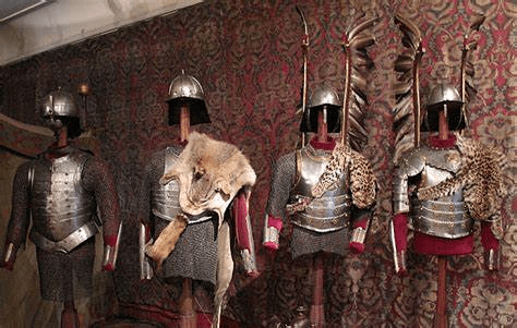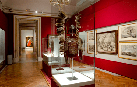 Vista de una de las salas de la exposición. En primer plano, Armadura de húsar con alas y piel de leopardo. Acero, bronce dorado, plata y piel de leopardo. Polonia Siglo XVII, Fundación Príncipes Czartoryski. Depósito Museo Nacional de Cracovia