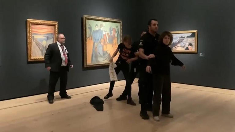 Dos de las activistas trataron de adherirse al cuadro mientras otra filmaba la escena, gritando No habrá ningún grito cuando la gente muera o Ningún grito cuando los políticos ignoran a la ciencia, recogió la agencia NTB.