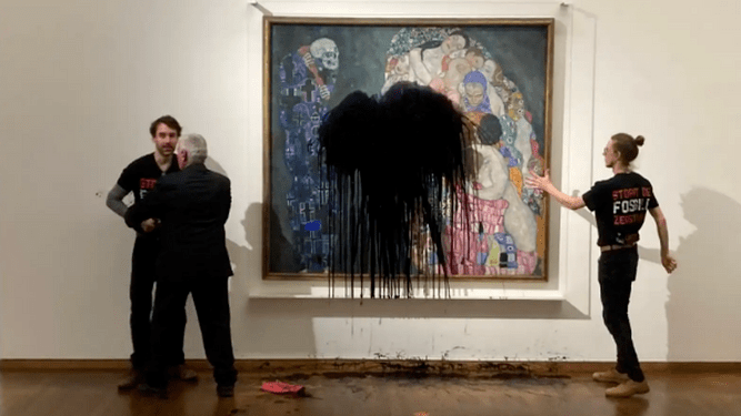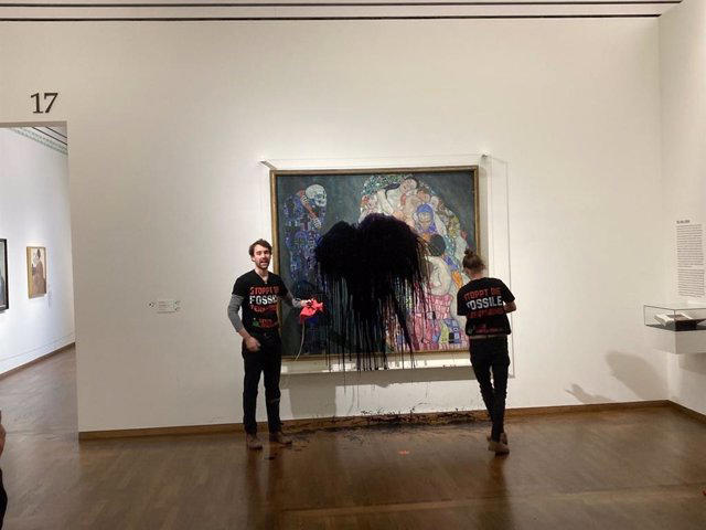 Activistas en defensa del medio ambiente han rociado con líquido negro un cuadro del pintor Gustav Klimt en el Museo Leopold de Viena, para denunciar que los nuevos pozos de petróleo y gas son una sentencia de muerte para la humanidad.