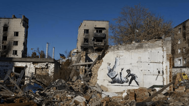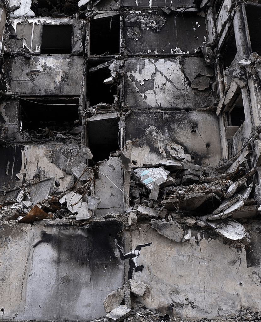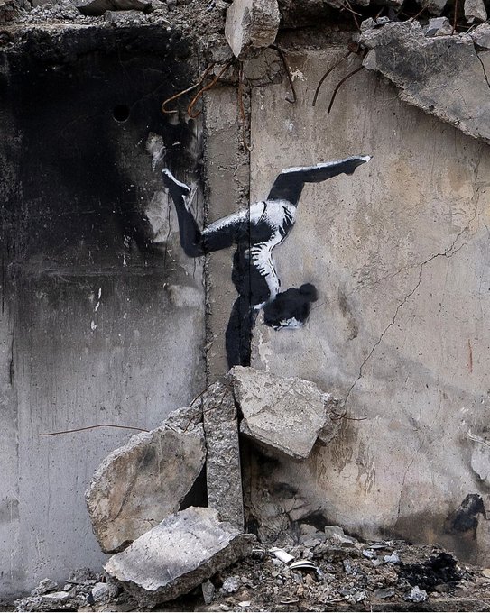 Banksy, el enigmático artista urbano británico, ha viajado hasta Ucrania para plasmar sus trabajos sobre las ruinas de los bombardeos. El dibujante ha pasado en concreto por la ciudad de Borodianka, en Ucrania, para representar a una gimnasta rítmica que practica un ejercicio de equilibrio sobre los restos de un edificio destrozado por los bombardeos de la guerra.