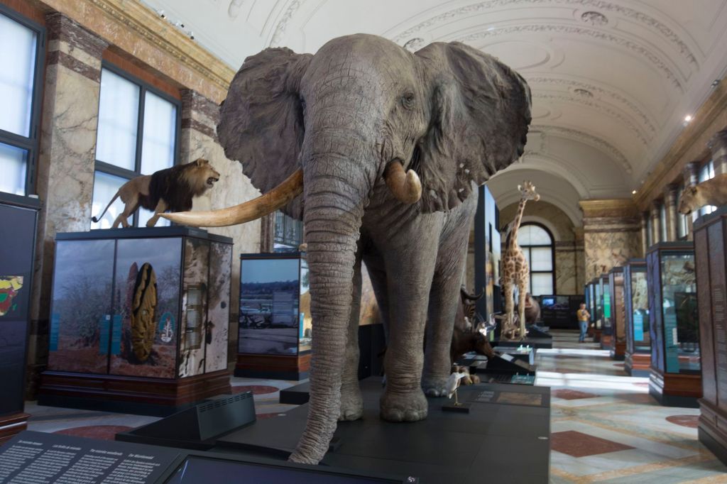 exhibido en el ‘Pabell—n de Fauna del Congo’ en la Exposici—n Universal de Bruselas, marzo-octubre de 1958. En realidad el ejemplar que se muestra en el museo son las partes de dos elefantes. Lleg— al museo a finales de 1958.