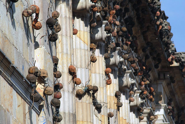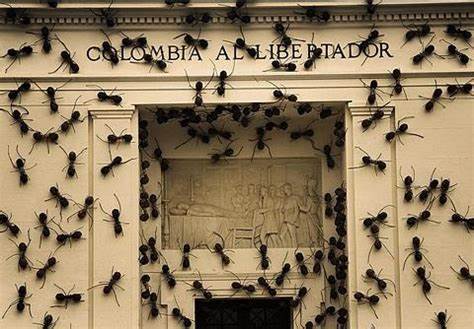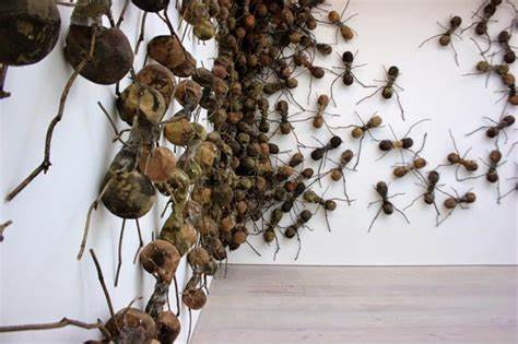 La procesión continúa dentro en las paredes de acceso y, una vez en el interior, vertebran la instalación Casa tomada, del artista colombiano Rafael Gomezbarros, que usa el carácter nómada, esfuerzo y capacidad de cooperación de los insectos como una metáfora del peso y el trabajo soportado por las personas que están obligadas a emigrar.