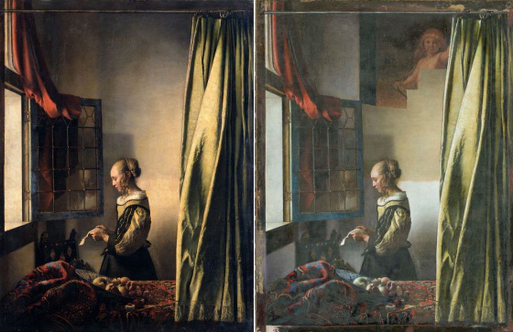 A la izquierda, la ‘Muchacha leyendo una carta’, de Johannes Vermeer, pintada hacia 1657 y expuesta en la Gemäldegalerie Alte Meister de Dresde, antes de que se destapase el Cupido. A la derecha, el mismo cuadro con el Cupido parcialmente destapado.