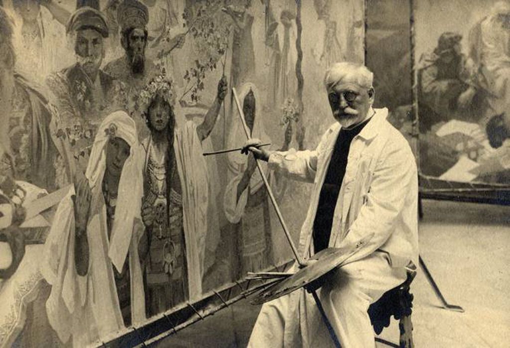 Autorretrato de Mucha en su estudio de Bohemia, trabajando en un cuadro de su serie ‘La épica eslava’.