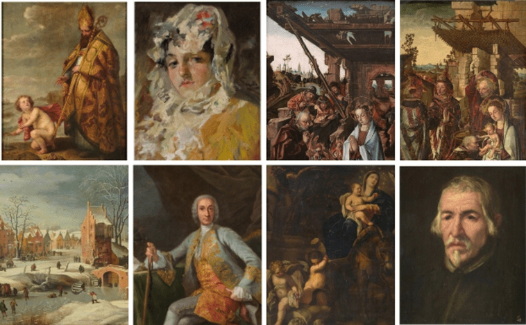 Entre las obras, destacan Cabeza de mujer con mantilla blanca, de Joaquin Sorolla; San Agustín meditando sobre el Misterio de la Trinidad, del taller de Rubens, Paisaje nevado, de Jan Brueghel el Joven, cuatro pinturas de José Gutiérrez de la Vega y Bocanegra y dos versiones de Amorcillos vendimiando de François Boucher.
