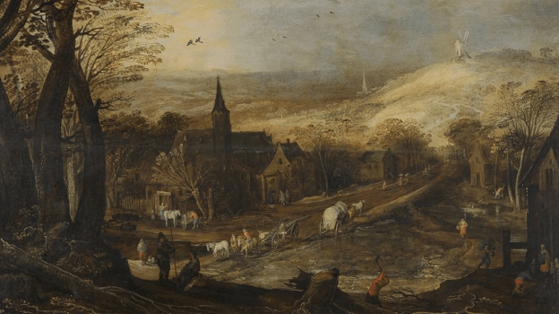 Atribuido a Jan Brueghel el Joven. Paisaje nevado. Después de 1625. Óleo sobre tabla, 45 x 76 cm.