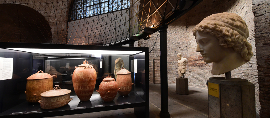 Testas votivas de necrópolis etruscas de Tarquinia, cerámica con barniz negro y figuras rojas (siglos V-IV a. C.) de la Magna Grecia… confluyen en este museo próximo a la estación de Termini. Explica el comandante Roberto Riccardi: