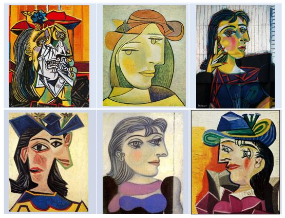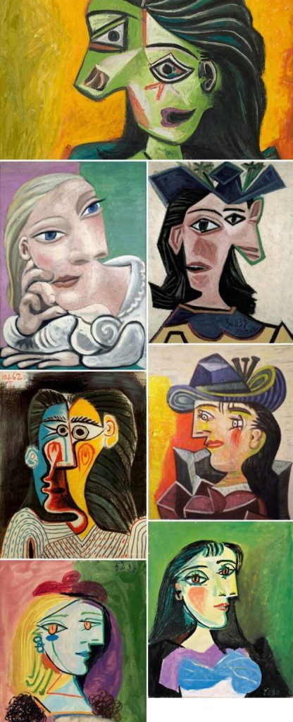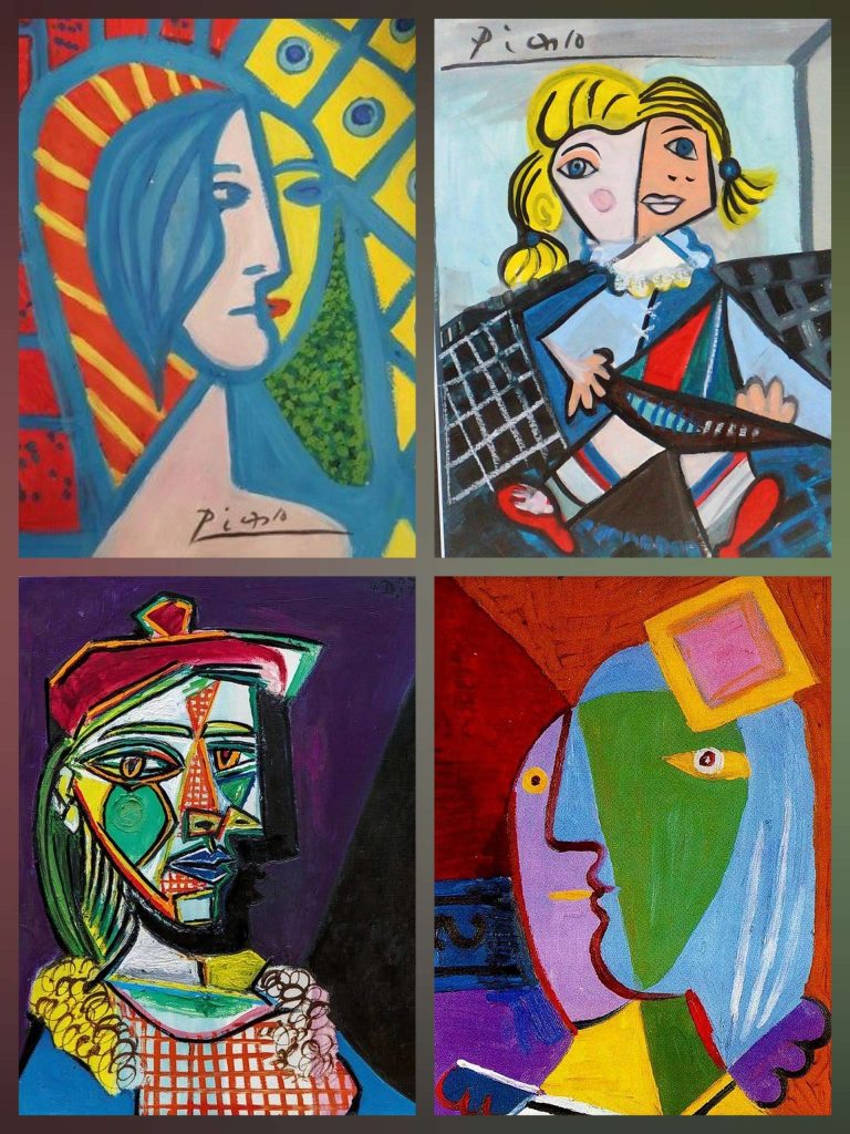 El cubismo analítico, el cubismo hermético, sus retratos cubistas, cubismo sintético, cubismo poético, cubismo surrealista, cubismo puntillista y cubismo frío.