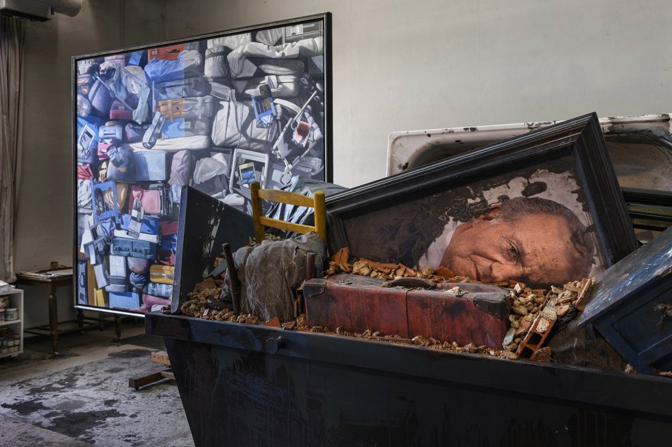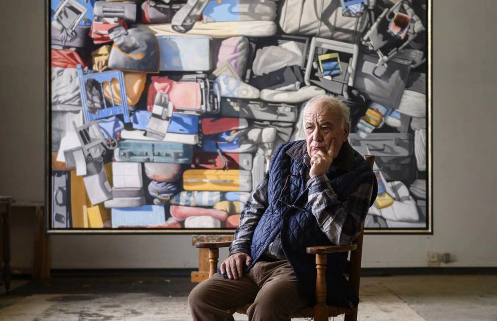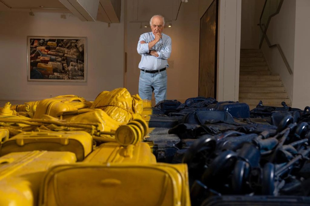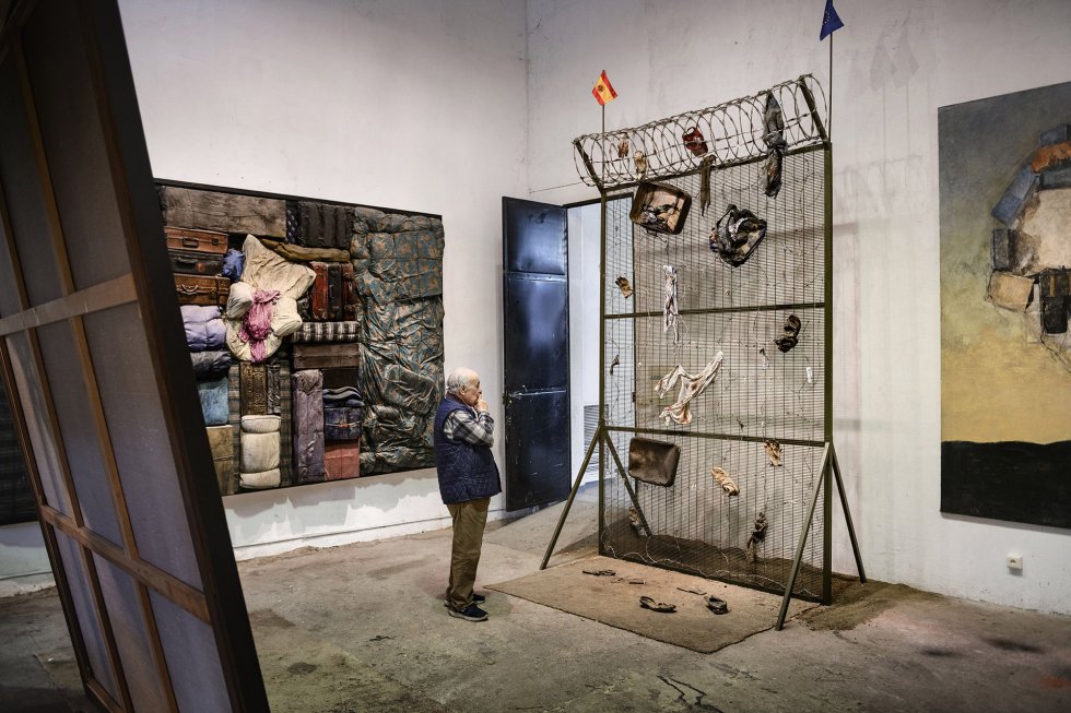 En su actual exposición en Málaga, Una aventura creadora, que se puede ver en el Centro de Arte Contemporáneo (CAC, hasta el 13 de septiembre), ofrece sendas instalaciones, una de ellas consistente en un cuadrilátero formado con 120 maletas pintadas con el amarillo y el azul de la bandera de Ucrania, otra referente a la valla melillense, titulada La tierra prometida: una alambrada terminada en concertinas, en las que quedan atrapadas las maletas y la sangre del autor. “