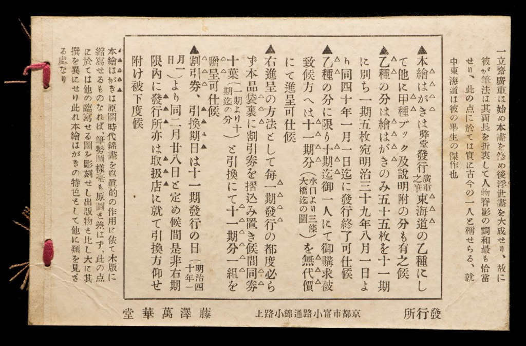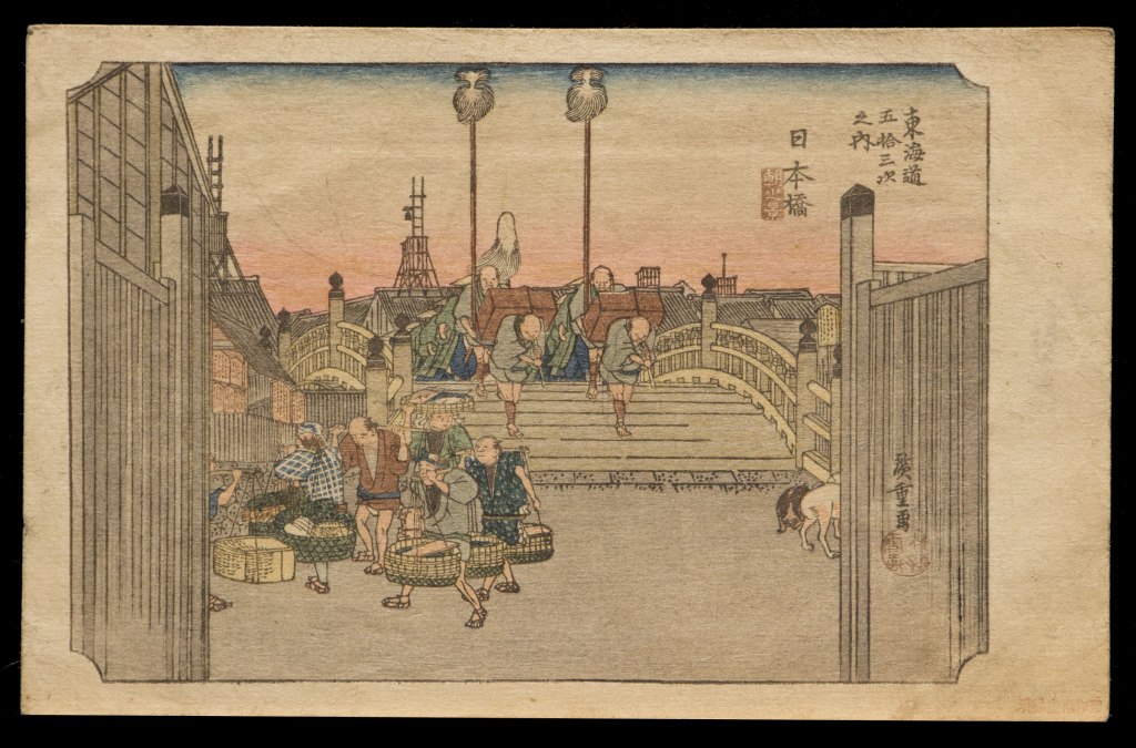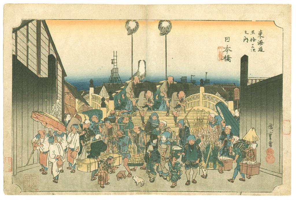 Al igual que Hokusai, Hiroshige creó varias series de estampas, siendo las dos más destacadas Cincuenta y tres etapas de la ruta de Tōkaidō y 100 vistas de Edo.