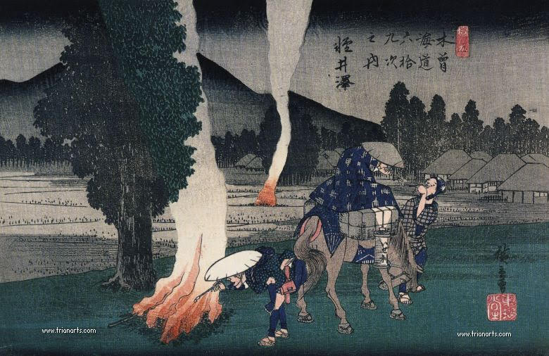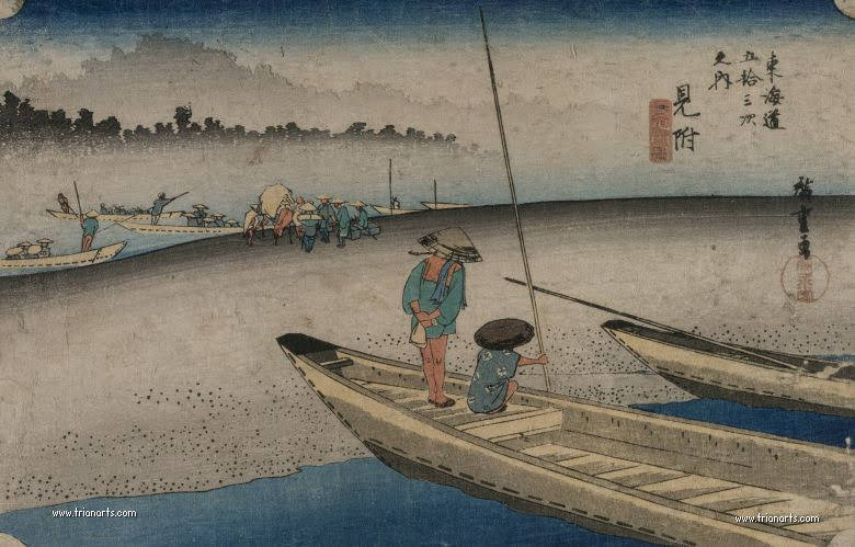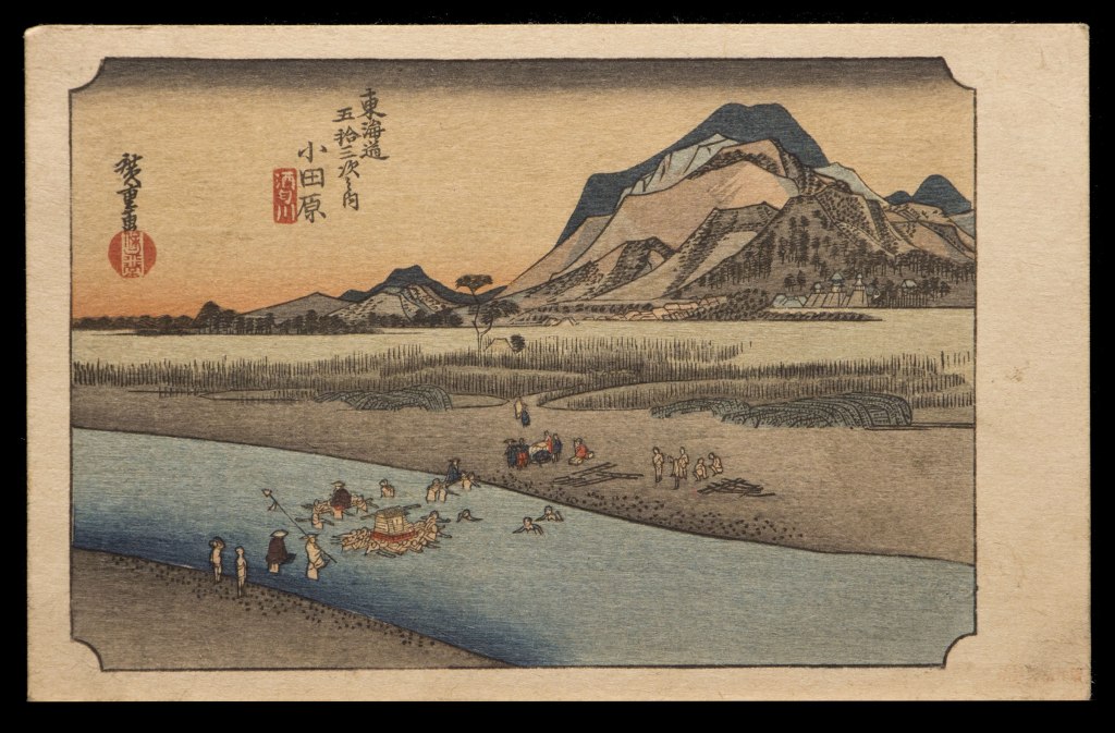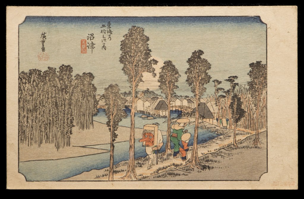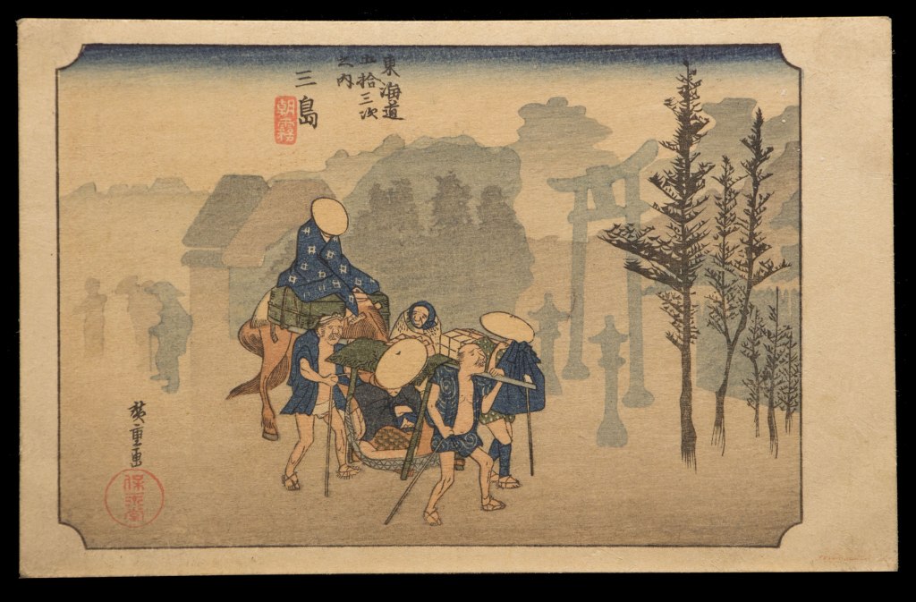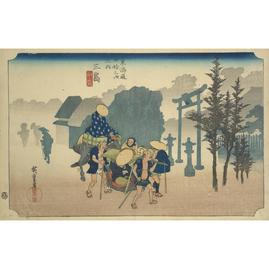De Mishima, población de la que procede la escena del grabado, sólo aparecen algunos edificios difuminados a la izquierda.