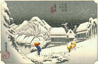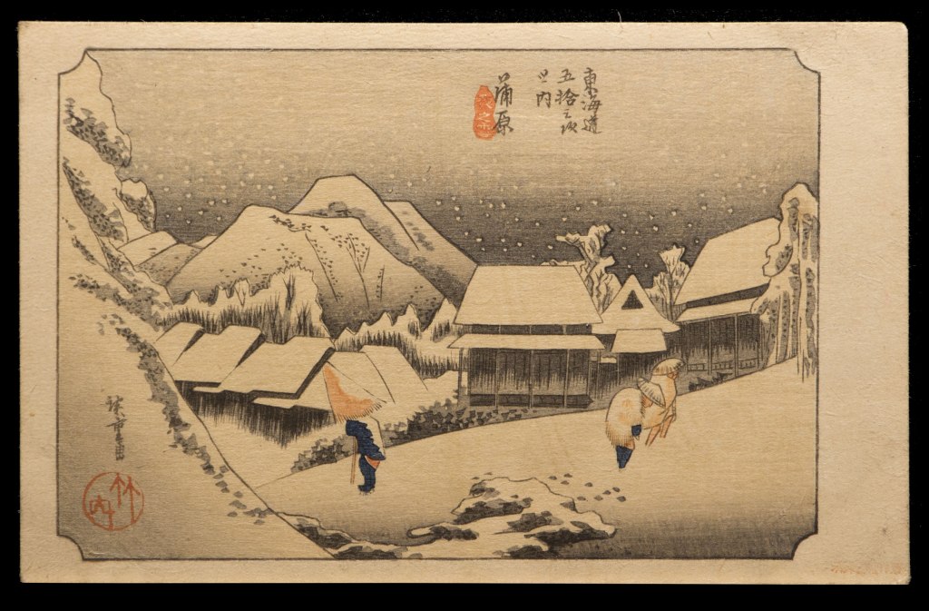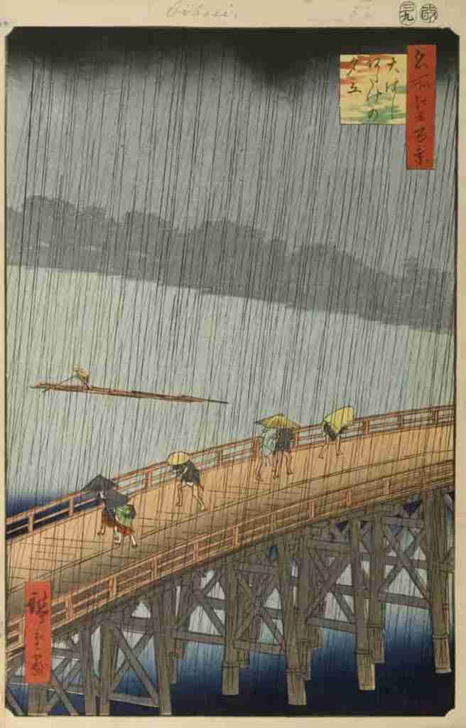 A Hiroshige le gusta mostrar el paisaje cubierto por una capa de nieve o desdibujado por una cortina de lluvia.