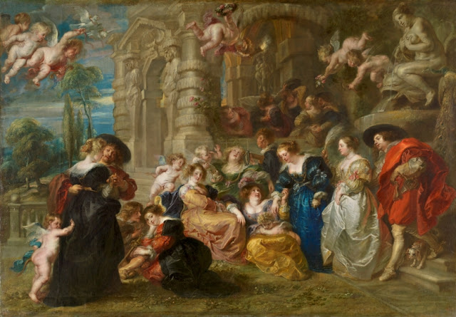 Una de las mujeres de la reunión, vestida de azul, guarda un parecido sorprendente con Helena Fourment, la esposa de Rubens en ese momento.