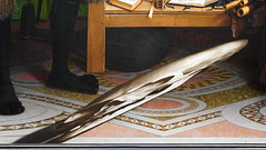 He points to a letter François de Dinteville wrote to Jean on 28 March 1533, in which he talks of an imminent meeting with the Pope and makes no mention of visiting London. Unlike the man on the right of the picture, François was older than Jean de Dinteville. The inscription on the man on the right’s book is «AETAT/IS SV Æ 25» (his age is 25); that on de Dinteville’s dagger is «AET. SV Æ/ 29» (he is 29).
