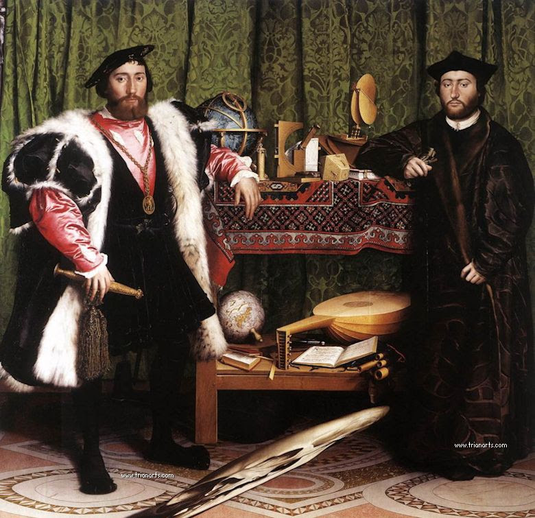 Los dos hombres están en una misión diplomática engañosa y finalmente infructuosa para curar la brecha entre Enrique VIII y la Iglesia de Roma, de ahí su nombre (plural), Los Embajadores.
