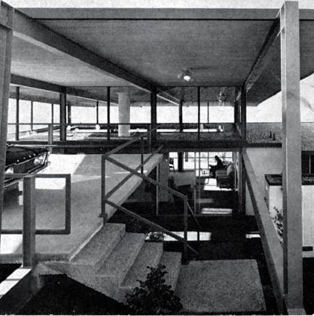The Case Study House No. 26 in San Rafael, California (1962-1963), also designed by Thorne with a steel skeleton, rests largely on free piers on sloping ground with a cantilevered overhanging part.