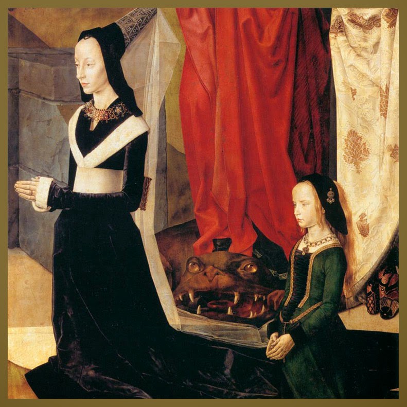 El ala de la derecha muestra igualmente arrodilladas a la esposa, María Portinari, con la primogénita Margarita, mostrando la misma inocencia infantil que sus hermanitos, y las santas elegantemente ataviadas Margarita, con libro, crucifijo y el dragón a sus pies, y Maria Magdalena también sosteniendo su atributo tradicional, el tarro de ungüentos; en el paisaje del fondo se distinguen las figuras de los Reyes Magos aproximándose al portal ante la sorpresa de los campesinos.