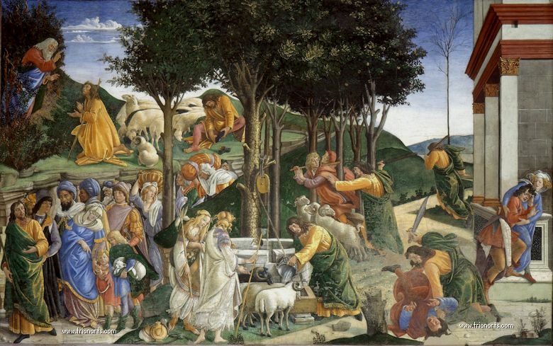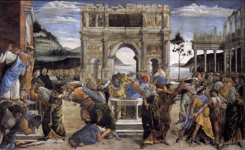 Alli pinta Las pruebas de Moisés, Las pruebas de Cristo y El castigo de los israelitas rebeldes.