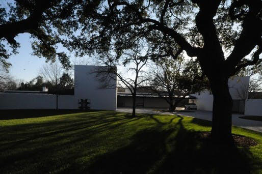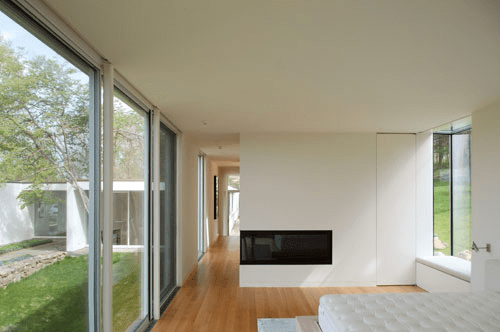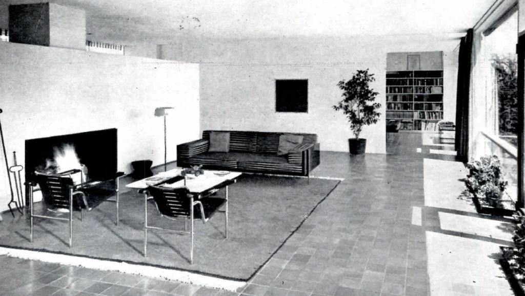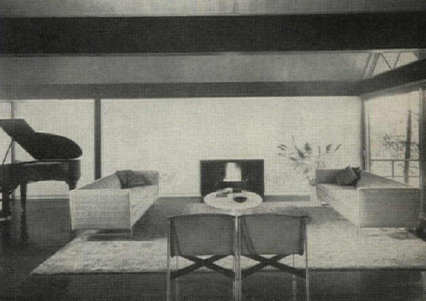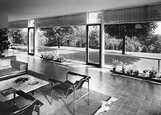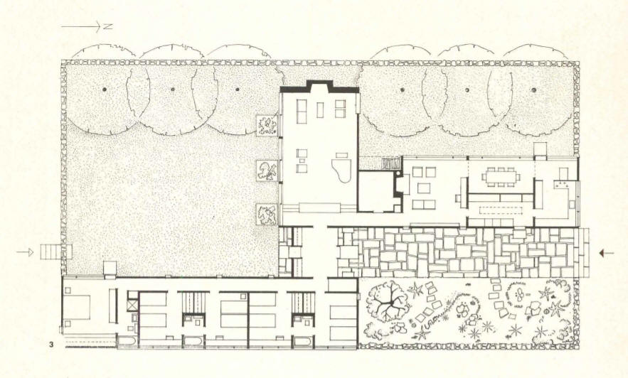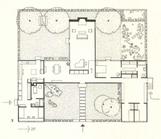 As part of his early modern works, Edward Larrabee Barnes built the Weiner house in Fort Worth, Texas (1952), one story, with a roof and floor-to-ceiling glazing on the garden side.