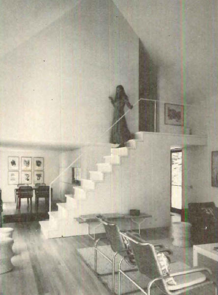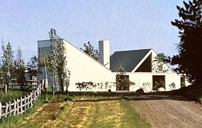 Sobre la azotea de la casa, que se arranca del paisaje en forma de ala, se alza el puntiagudo frontón del cuarto de estar con sus cristales policromados.