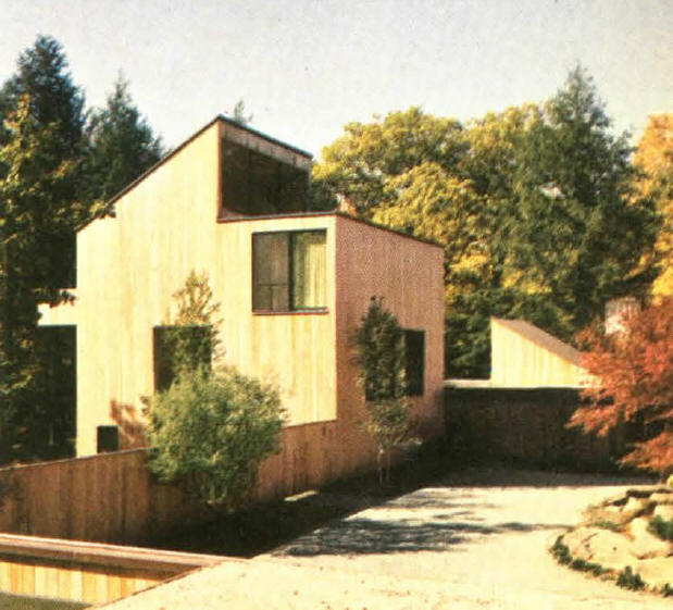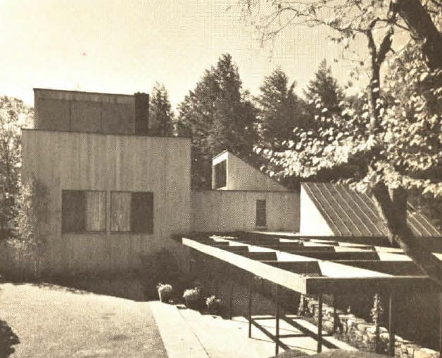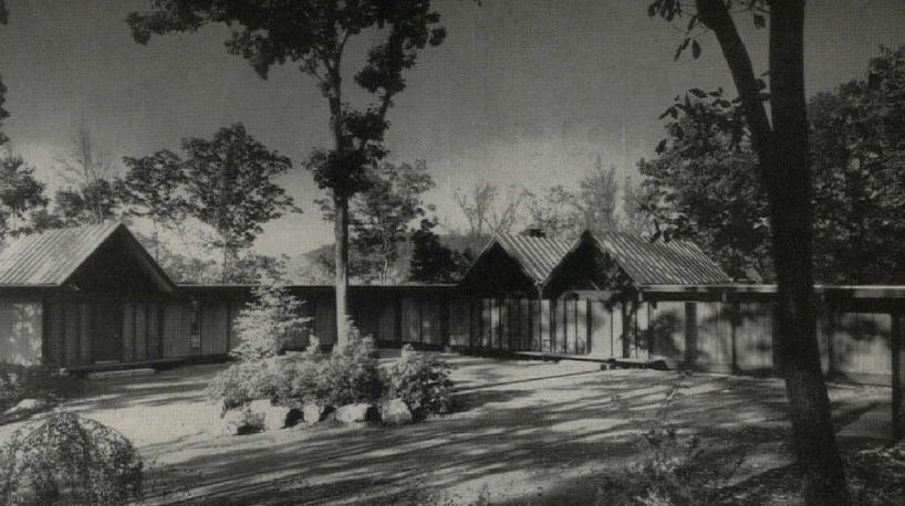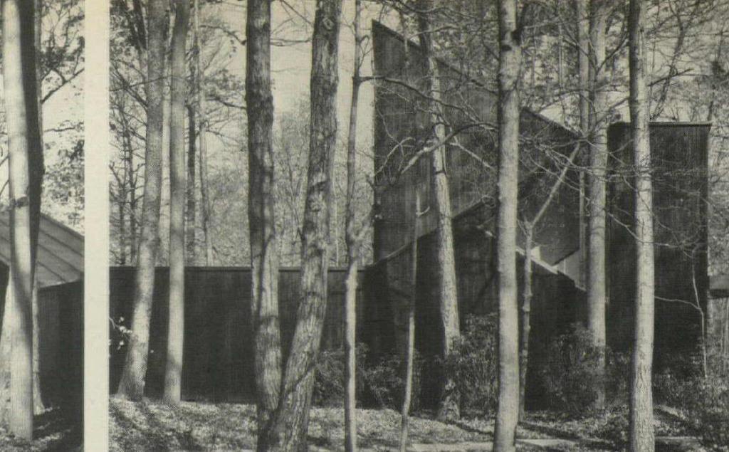 1956-1958 La casa Straus en Pond Ridge, Nueva York, construida casi totalmente sobre soportes, con el revestimiento oscuro de sus fachadas se adapta delicadamente al terreno, que es boscoso y se encuentra junto a un lago.