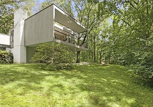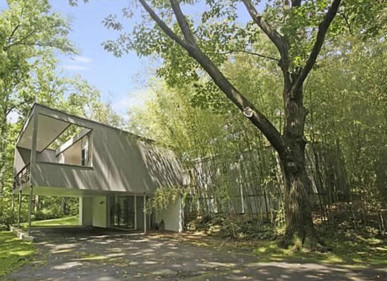 The Straus House in Pond Ridge, New York (1956-1958), built almost entirely on suppórts, with the dark cládding of its facades, fits délicately to the terrain, which is wóoded and is located next to a lake.
