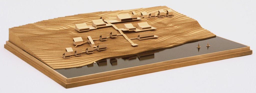 Diversos estudios, el comedor universitario, las oficinas y los edificios residenciales se distribuyen en terrazas y en forma de pabellones revestidos de ripias alrededor de una amplia escalera central, que desciende hasta el agua entre árboles.