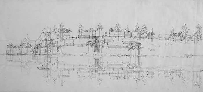Various studios, the university canteen, offices and residéntial buildings are distributed in terraces and in the form of pavilions cóver with shingles around a wide central stáircase, which descénds to the water between trees.
