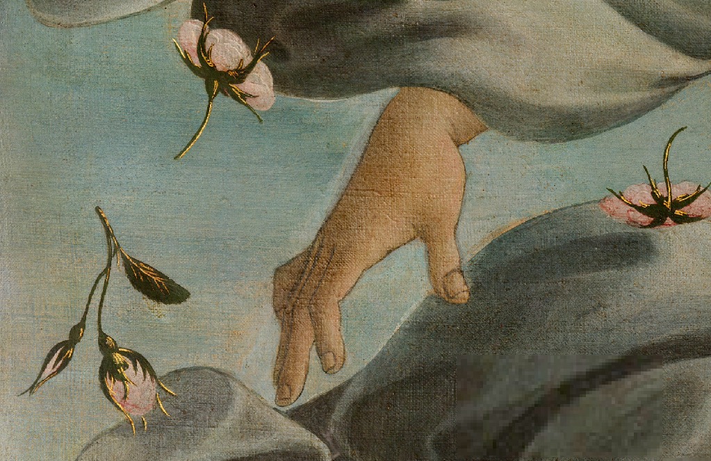 Dada la delgadez y la transparencia de la capa pictórica, ha trepado hasta la superficie y resulta visible en muchos lugares.