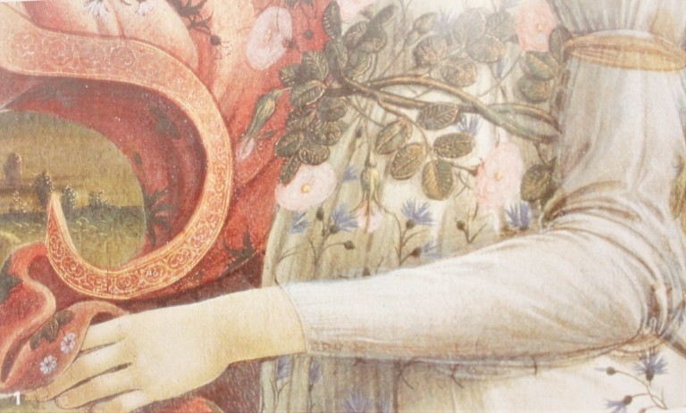 On the Archangel’s mantel Bosch drew very close parallel lines adapted in length and design to the forms of the folds and similar to those to be seen in other works of this late period, such as the Saint Anthony Triptych in Lisbon.