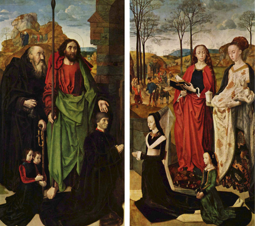 On the left wing of the altarpiece, Portinari and his sons Antonio and Pigello are represented kneeling in prayer, with Saints Antonio, patron of the hospital to which the altarpiece was destined, with his staff in tau and bell and Tomás, patron of the (cláint) client, also with his (atríbiut) attribute: the (espír alúdin) spear, alluding to the well-known épisode of his disbelief; the landscape in the background represents the (errábol) arrival of José and María in Bethlehem.