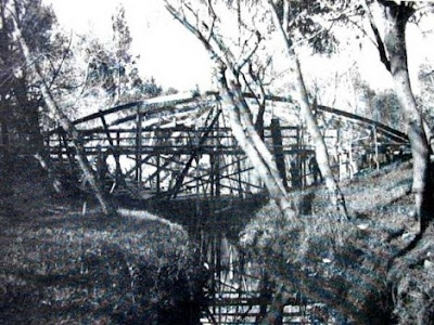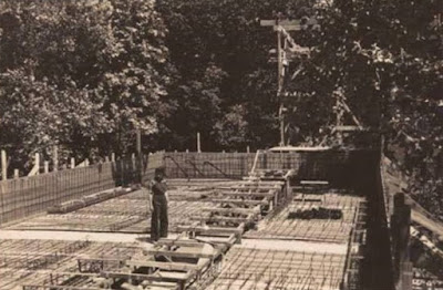 A concrete arch with two supports that extends over a stream serves as the base for the rectangular body of one story.