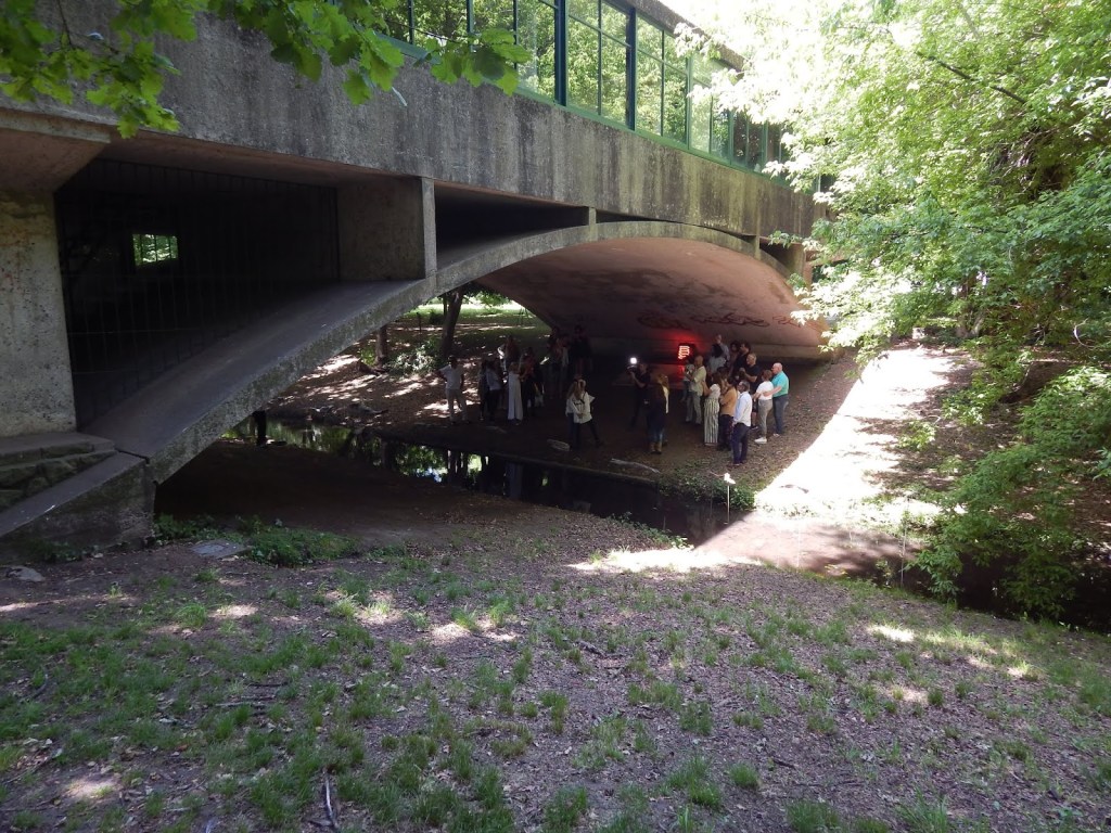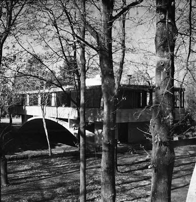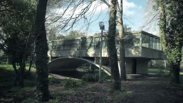 Un arco de hormigón con dos soportes que se extiende sobre un arroyo sirve de base para el cuerpo rectangular de un piso.
