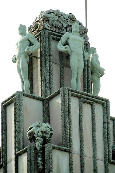 Los tejados a dos aguas se construyen en ángulos muy cerrados componiendo figuras triangulares en diferentes niveles, y las torres –tanto las circulares como las rectangulares– se realizan estrechas y altas, dando como resultado un edificio que se eleva estilizado hacia el cielo.
