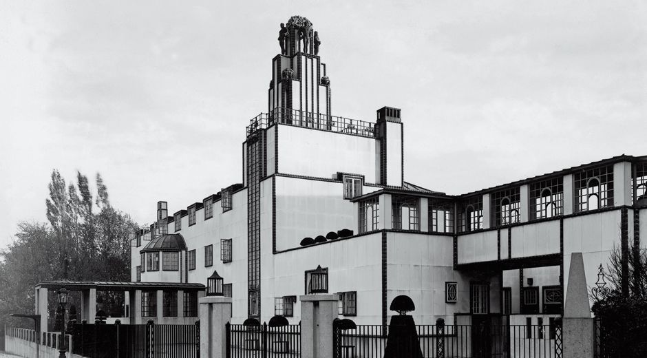 Una serie de arcos rodea el exterior del edificio, mientras los tejados presentan distintos niveles, uno encima del otro.