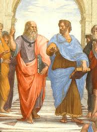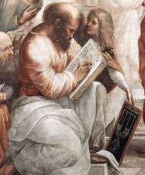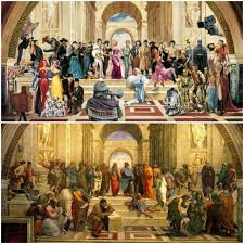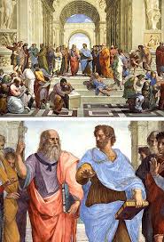 Platón tiene los rasgos de Leonardo, levanta el dedo índice hacia el cielo, mientras que Aristóteles extiende su mano libre en un gesto que quiere abarcar la extensión terrestre.