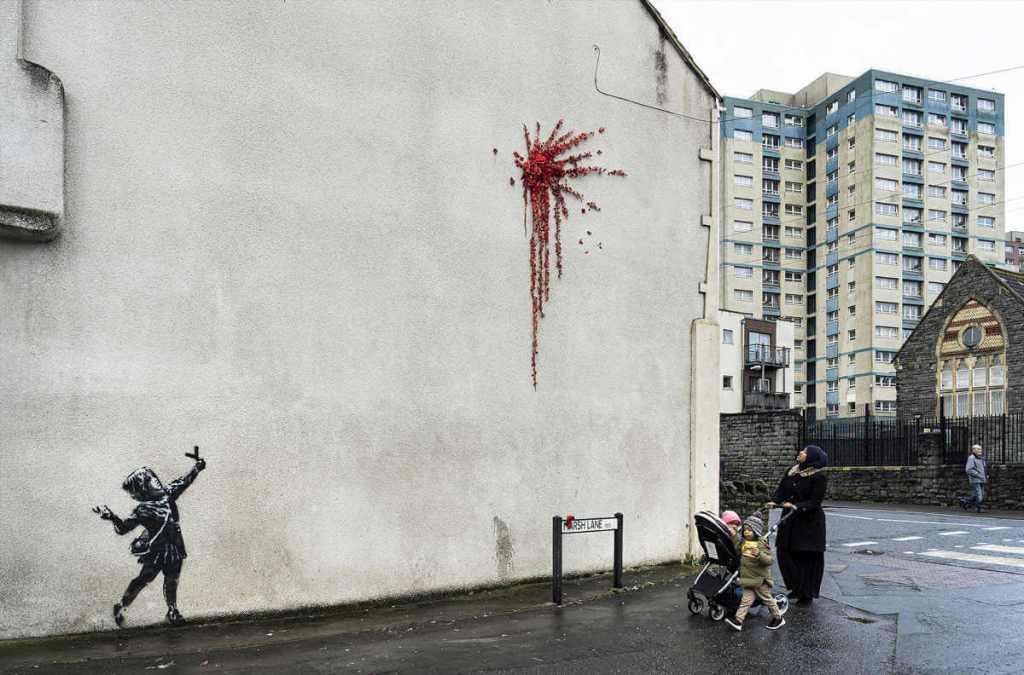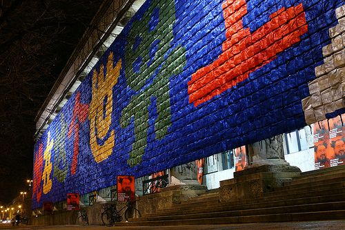 Para la confección de la instalación utiliza nueve mil mochilas escolares que abarcan toda una fachada.